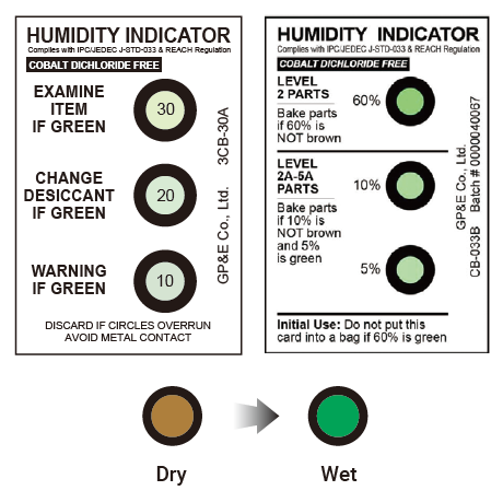 HIC allows fast visual inspection of the Relative Humidity(RH) in sealed packaging and containers. As the humidity increases, the chemically impregnated spots will be changed traditionally from blue to pink (Cobalt-HIC), blue to pink (CDF-HIC), brown to green (CB-HIC), yellow to green (CF-HIC) and green to purple (MF-HIC). Our HICs have 3 spots or 6 spots, but we also have a one spot type. It contains 3 spots, but only one spot is ch emically impregnated and other two spots are just printed with reference colors for “OK” and “NG” (not good) so that user can easily check if it is failed