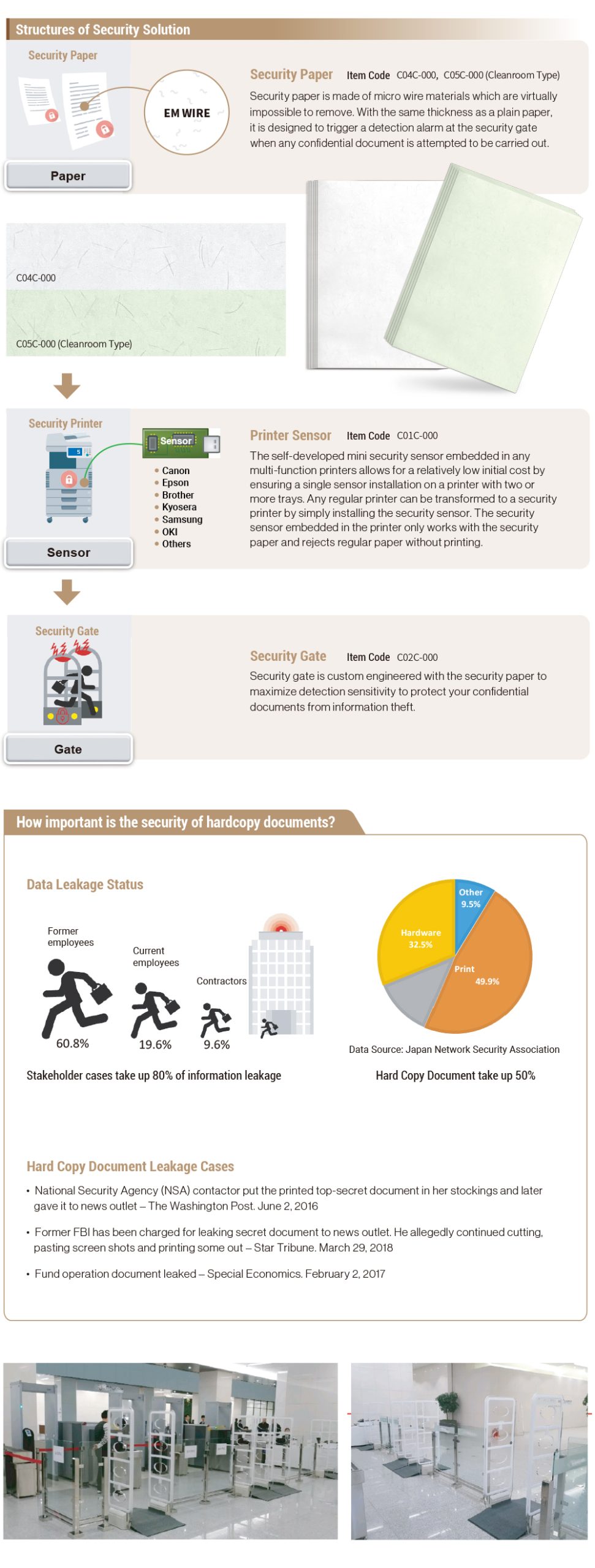 Security paper is made of micro wire materials which are virtually impossible to remove. With the same thickness as a plain paper, it is designed to trigger a detection alarm at the security gate when any confidential document is attempted to be carried out.